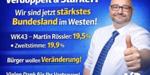 Erst in Baden-Württemberg und Hessen verdoppelt.Heute in Rheinland-Pfalz stärkstes Bundesland im Westen! Unser WK 43:Direktkandidat Martin Rössler: 19,5 ProzentZweitstimme: 19,9 Prozent Viele Bürger sind unzufrieden mit der Politik.Sie wollen Veränderung! …