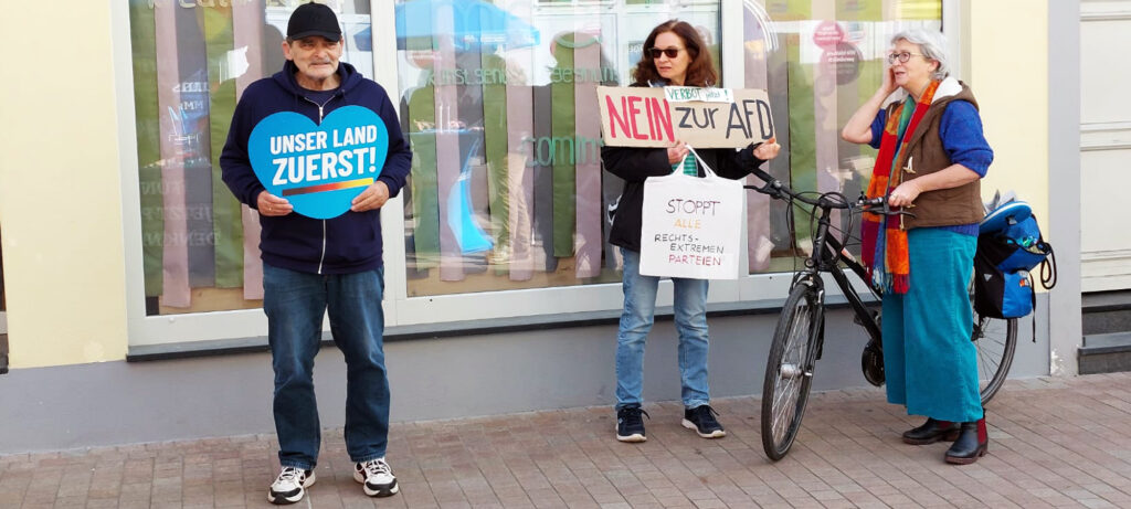 Wie bereits in den vergangenen Wochen positionierten sich erneut Aktivisten der Gruppe „Omas gegen Rechts“ ohne Genehmigung gegenüber unserem Infostand. Dieses Mal sahen wir davon ab, die Polizei einzuschalten. Bemerkenswert war vielmehr die Reaktion vieler Passanten: Zahlreiche Bürger reagierten mit Spott und Gelassenheit auf die Aktionen.