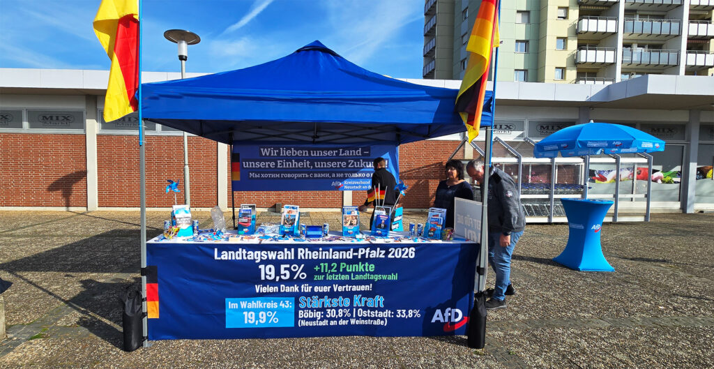 Bei der Bundestagswahl 2025 waren wir auch in den Ortsteilen Böbig und Oststadt stärkste Kraft. Darauf ist die Presse zunächst nicht eingegangen. Nachdem wir bei der Landtagswahl 2026 erneut stärkste Partei wurden, wird dies nun sogar in der Presse aufgegriffen. In dem Artikel „Blaue Tupfer“ (Rheinpfalz vom 24.03.2026) heißt es, dass die AfD in der Stadt im Vergleich zu 2021 um 9,6 Prozentpunkte zugelegt hat und nun bei 18,5 Prozent liegt. Die Partei wird in Neustadt also zunehmend stärker.