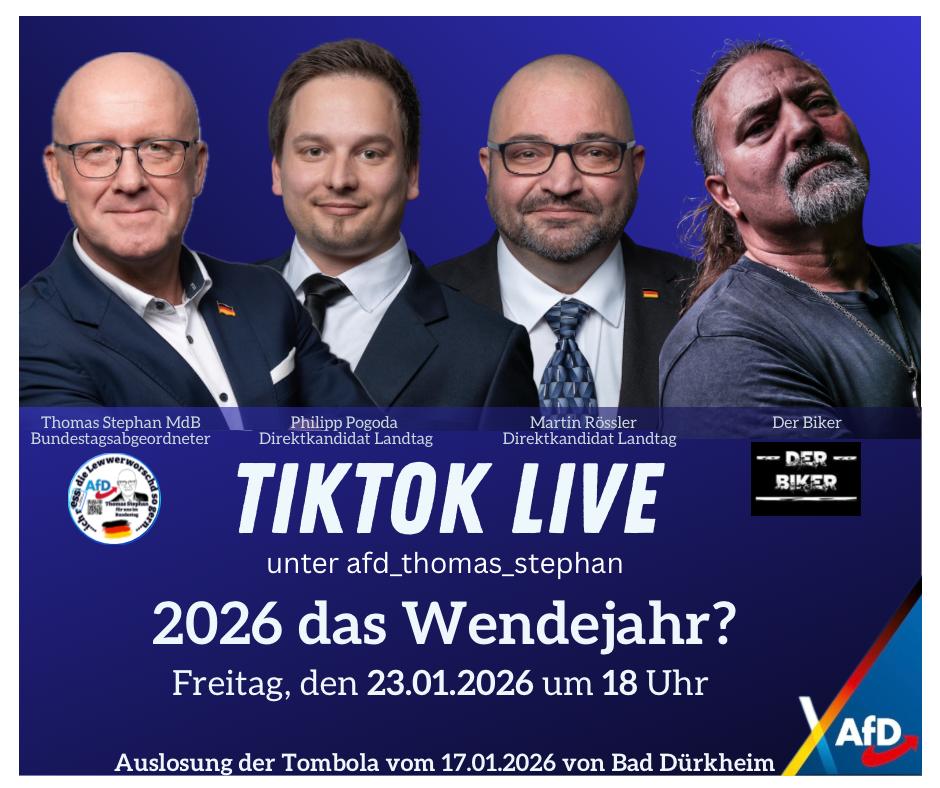 Am Freitag, den 23.01.2026, fand auf dem Account von Thomas Stephan MdB ein zweistündiger TikTok-Live zum Thema „2026 – das Wendejahr?“ statt. Mit über 2.000 Zuschauern und mehr als 50.000 Likes zeigte sich das große Interesse an den klaren Positionen der AfD.